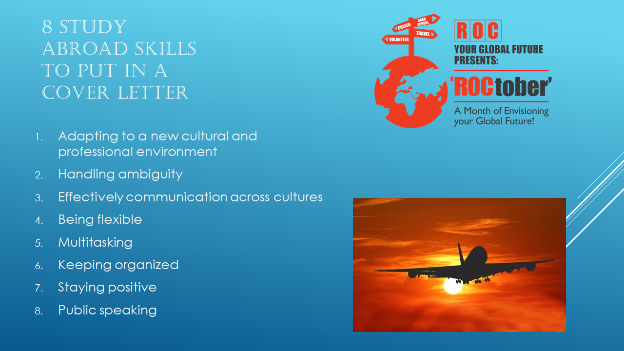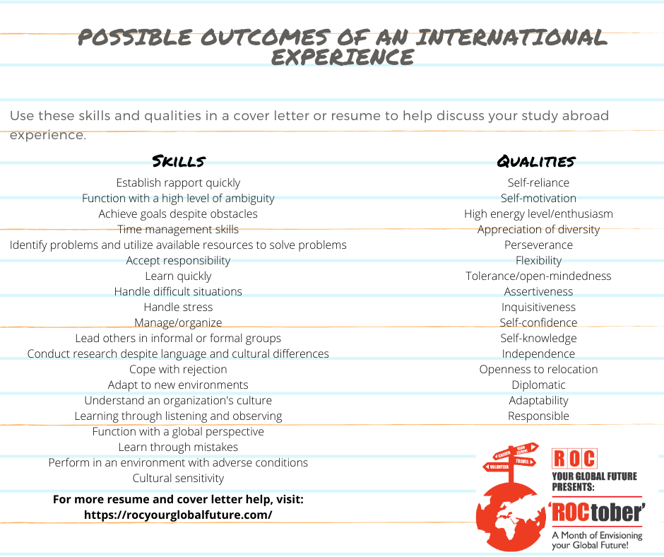 Focus: Develop skills to be able to articulate your study abroad experience(s) to potential employers. Engage and use the following resources to learn how to market their experience on a resume, cover letter, and in an interview.