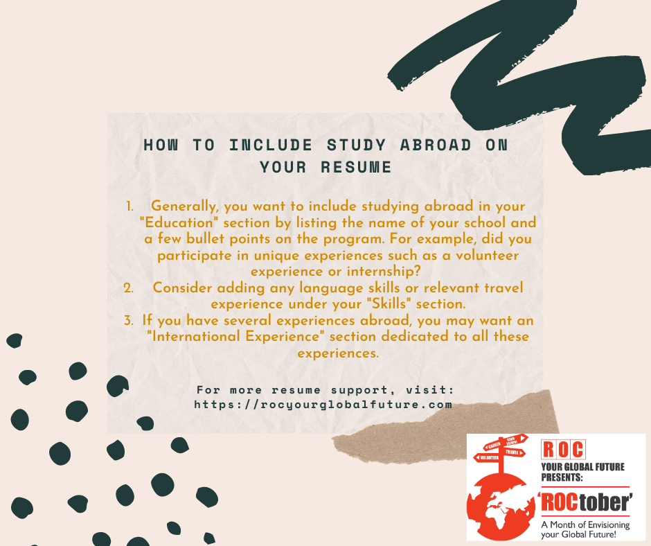 - Generally, you want to include studying abroad in your “Education” section by listing the name of your school and a few bullet points on the program. For Examples, did you participate in unique experiences such as service learning or an internship?